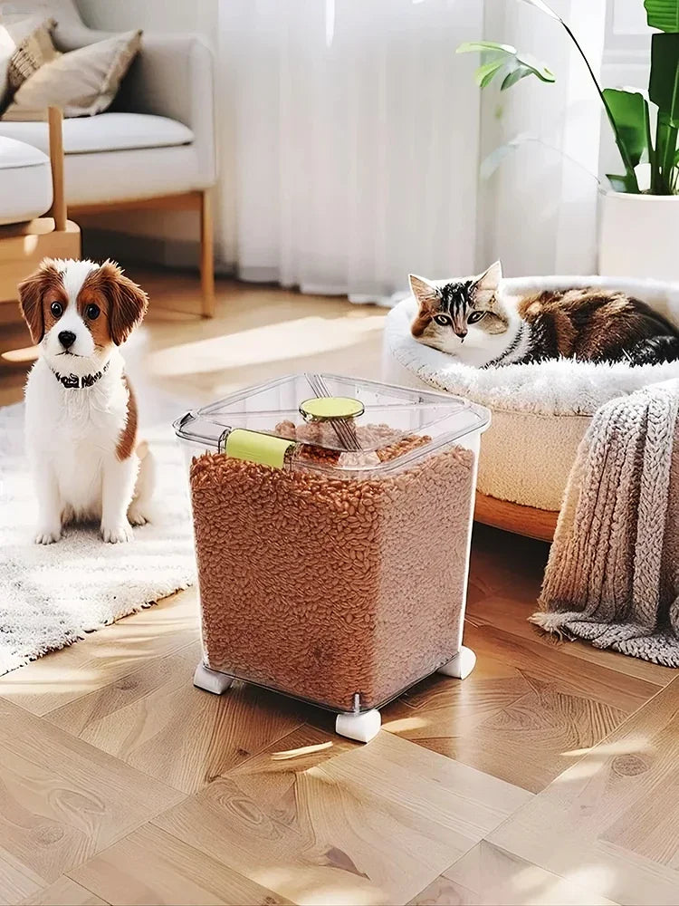 Large Capacity Transparent Dog And Cat Food Storage Container on Wheels Mobile Pet Feeding Bin with Clear Body for Easy Viewing